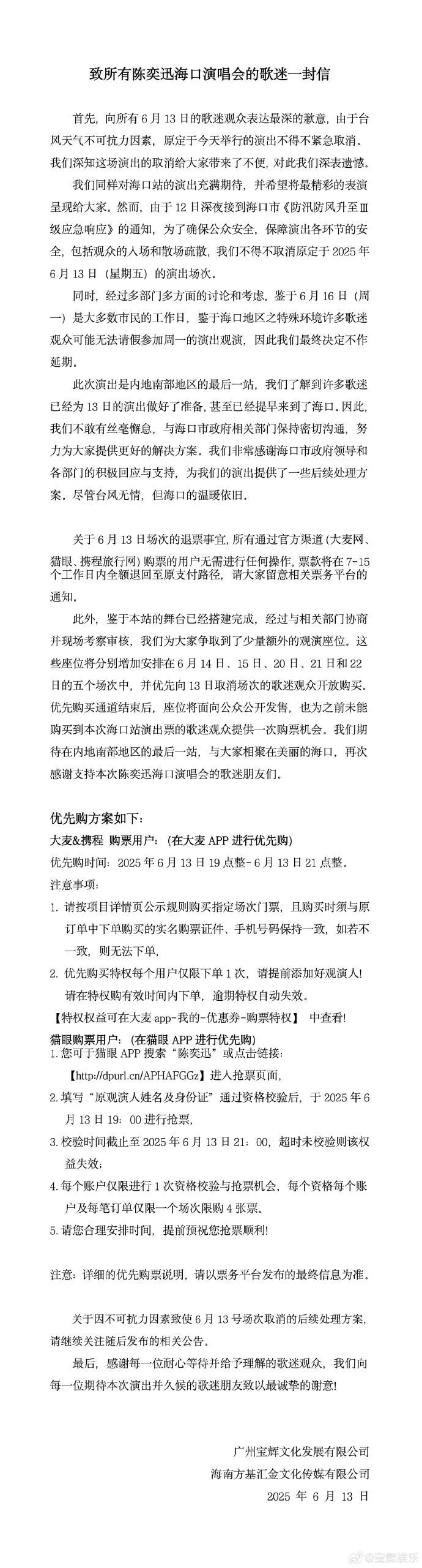 今日14时许股利网,@宝辉娱乐发布致所有陈奕迅海口演唱会的歌迷一封信。