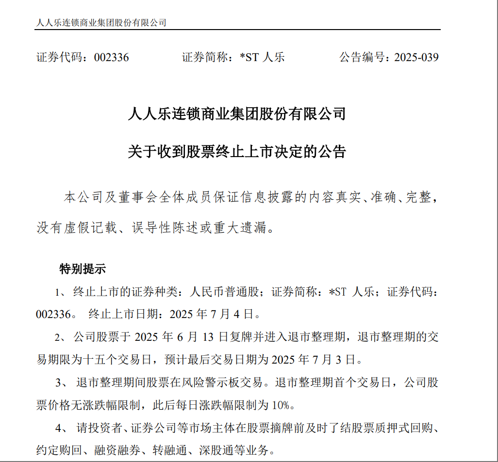 6月5日晚,*ST人乐(002336)公告称,公司于2025年6月5日收到深交所《关于人人乐连锁商业集团股份有限公司股票终止上市的决定》,深交所决定终止公司股票上市。公司股票将于2025年6月13日复牌并进入退市整理期,退市整理期的交易期限为十五个交易日,预计最后交易日期为2025年7月3日。