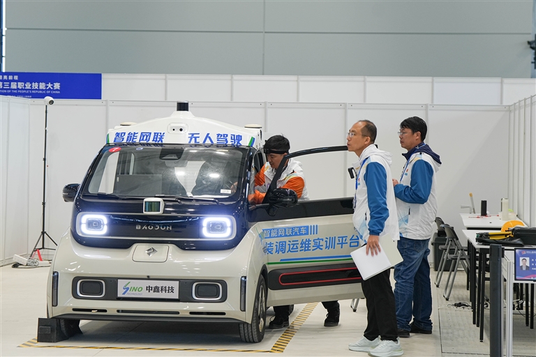 第三届全国技能大赛智能网联汽车装调运维赛场上米涂配资,河南选手李晓强(左一)正在专心进行比赛。河南日报社全媒体记者 徐聪 摄