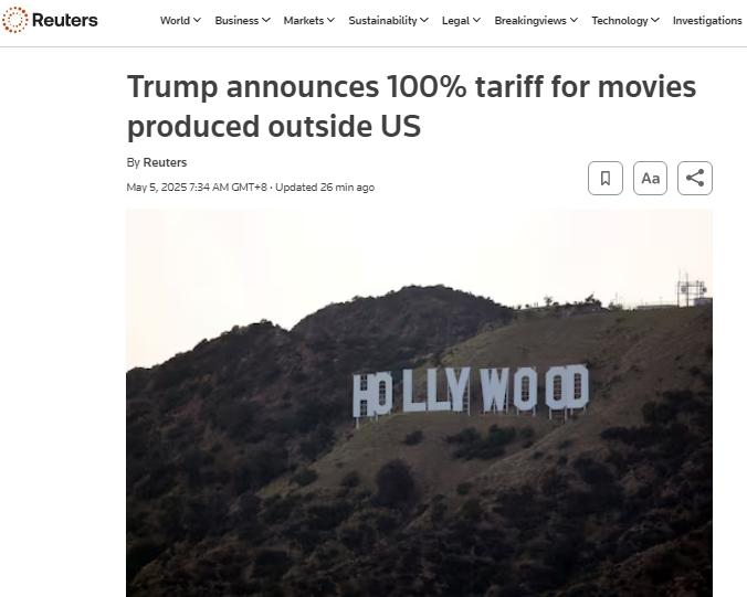 中新网5月5日电据路透社报道富明证券,当地时间4日,美国总统特朗普在社交媒体平台上发文称,授权商务部和美国贸易代表立即启动相关程序,对所有在外国制作的进入美国的电影征收100%关税。