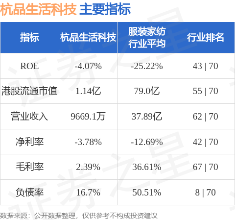 杭品生活科技港股市值1.14亿港元,在服装家纺行业中排名第55。主要指标见下表: